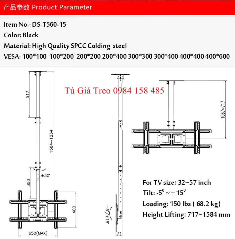 Giá treo tivi thả trần NBT560-15 dùng cho màn hình từ 32-70 inch