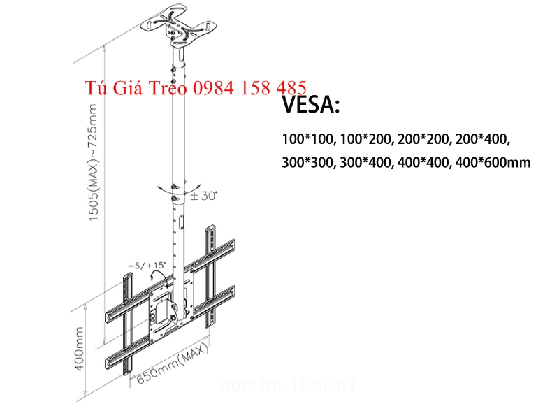 *Chiều cao sản phẩm giá treo tivi thả trần NBT560-15 có thể điều chỉnh từ 28.5 " (72,5 cm) đến 59.3 " (150,5 cm).